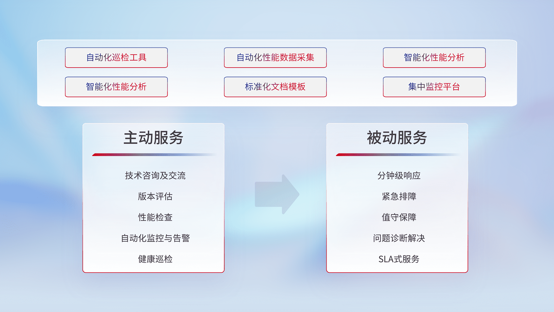 智能化工具和标准化文档,,保障服务质量,,,提供主动服务(包含技术咨询、、、版本评估、、性能检查、、、、自动化监控与告警、、、、健康巡检)和被动服务包含(分钟级响应、、、紧急排障、、、值守保障、、、问题诊断解决、、、SLA服务)。。。