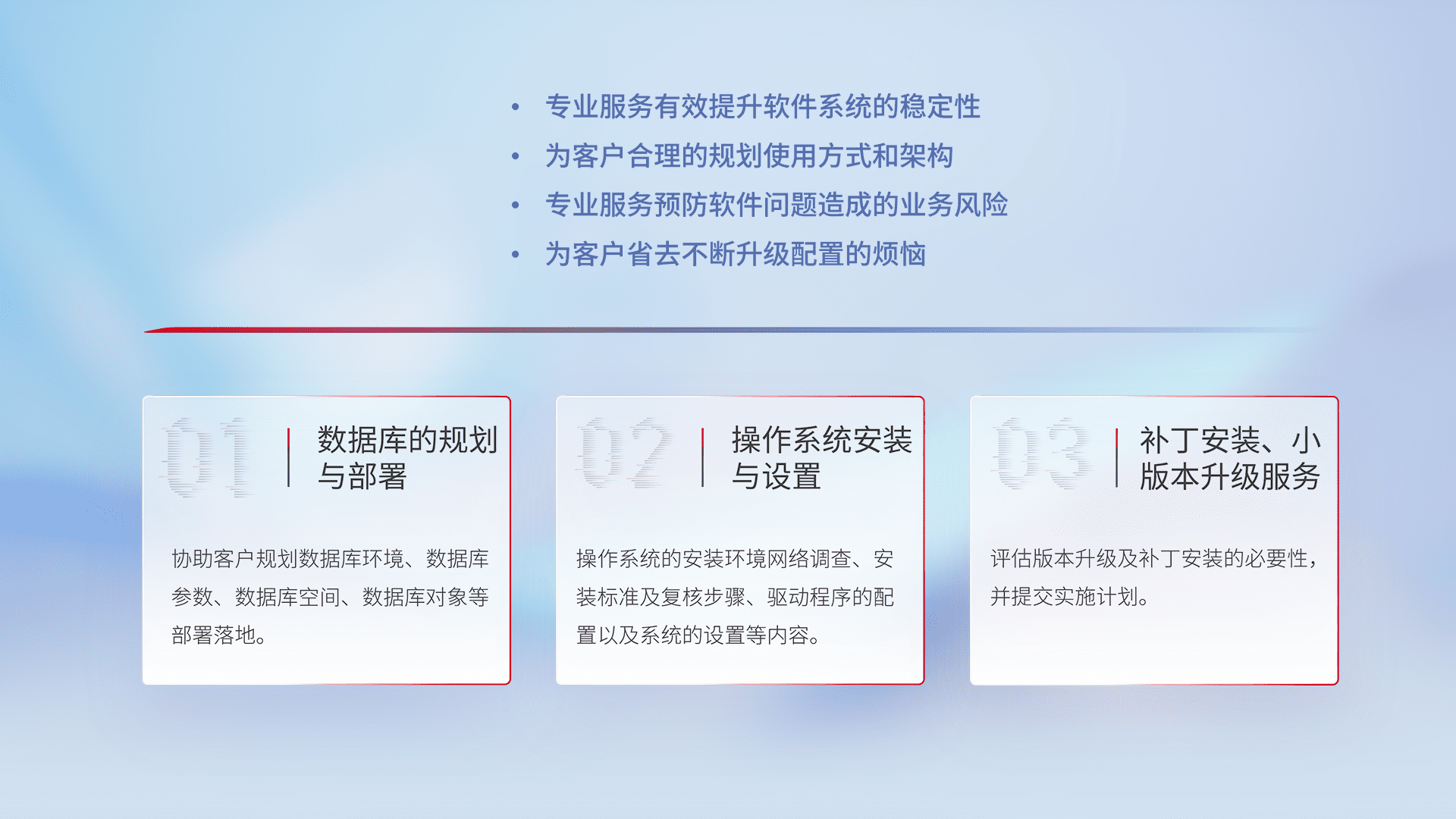 为客户提供软件规模升级、、、、快速部署、、、按需配置的专业服务,,,从数据库的规划与部署到操作系统的安装与设置,,,再到补丁安装和小版本升级提供支持。。。。
